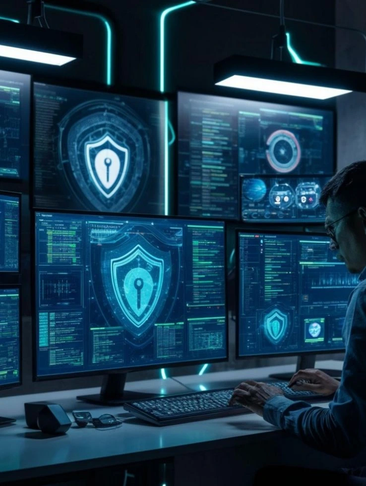Futuristic cybersecurity solutions with AI driven threat monitoring and automated incident response.
